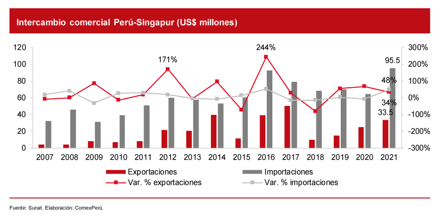 De acuerdo con cifras de la Sunat, el Perú cerró el año 2021 con un intercambio comercial (exportaciones más importaciones) con Singapur de US$ 129 millones, la cifra más alta registrada en la historia de la integración con ese país. Específicamente, durante 2021, exportamos bienes por US$ 33.5 millones (+33.6% con respecto a 2020) e importamos por US$ 95.5 millones (+47.8% millones). Cabe recordar que estos buenos resultados son fruto del tratado de libre comercio con Singapur, que entró en vigor desde el 1 de agosto de 2009. Durante estos 12 años de facilitación comercial, se han realizado envíos por US$ 279.8 millones y recibidos bienes por US$ 791 millones.