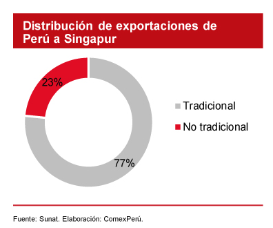 En términos de la estructura de las exportaciones peruanas a Singapur, nuestros envíos son principalmente del rubro no tradicional. De los US$ 33.5 millones exportados en 2021, US$ 25.7 millones corresponden al rubro tradicional (12.8 veces más de lo que se exportaba dentro de este rubro en 2011) y US$ 7.8 millones, al no tradicional. Dentro del tradicional, la totalidad corresponde al sector minero: productos de cobre, concentrados y minerales. En cuanto al rubro no tradicional, el 40.6% del valor exportado corresponde al sector agropecuario, seguido del sector pesquero (35.3%).