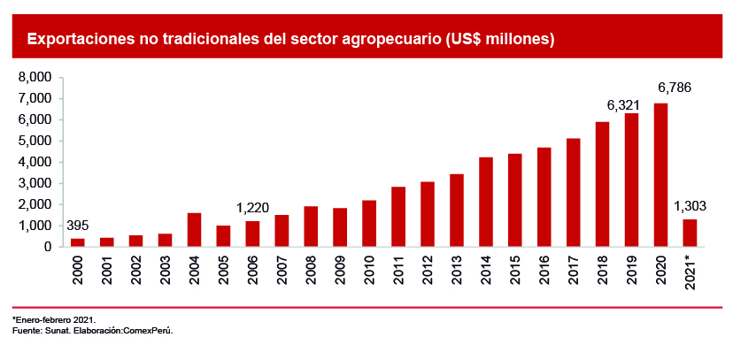 Una clara muestra de estos beneficios es la evolución de las agroexportaciones no tradicionales. En el año 2000, su valor alcanzó los US$ 395 millones, mientras que en 2020 sumaron US$ 6,786 millones, lo cual refleja que en el transcurso de 20 años las exportaciones alcanzaron 17 veces más su valor inicial en el periodo mencionado. Así, estos envíos al mundo alcanzaron un crecimiento acumulado del 1,620% en el periodo 2000-2020, con un crecimiento promedio anual del 15.3%.