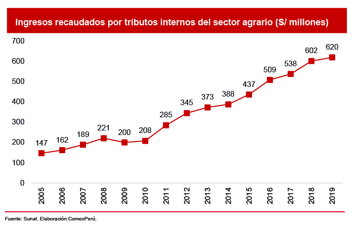 Además, también hay beneficios por parte de la Ley de Promoción Agraria. Según cifras de la Enaho 2019, en dicho año, la actividad agraria y la agroindustria reunieron al 25.7% de la población económicamente activa (PEA) ocupada, es decir, 4.5 millones de trabajadores ejercieron sus labores en el sector. Además, desde 2007 se observa un aumento gradual de la formalidad laboral asalariada, año en el que esta representaba el 11.7% y alcanzó un 17.9% en 2019, un incremento de 6.2 pp. Esto acarreó beneficios en materia tributaria, pues los ingresos estatales recaudados por tributos internos pasaron de S/ 189.2 millones a S/ 620.1 millones en el periodo mencionado.