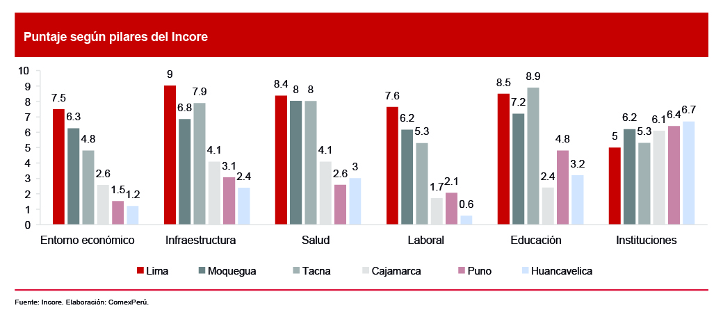 Dicho lo anterior, el Índice de Competitividad Regional (Incore), desarrollado por el Instituto Peruano de Economía, hace evidente la existencia de una notable diferencia estructural entre los departamentos. A través del uso de distintos indicadores, agrupados en seis pilares claves[1], el Incore busca evaluar la competitividad como vehículo de desarrollo económico y social.