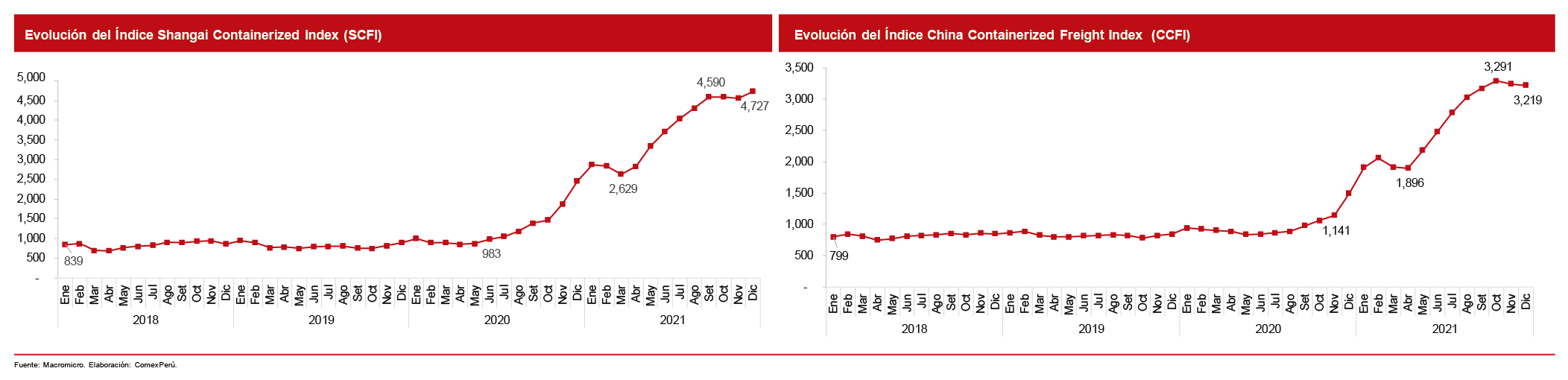 En lo que respecta al primero, ascendió a 4,727 puntos entre el 1 y 10 de diciembre de 2021, un 92.5% más que el mismo mes de 2020; mientras que el segundo, a 3,219 puntos (115.7%). Como se observa en los gráficos, el costo de los fletes supera por mucho los niveles previos a la pandemia.