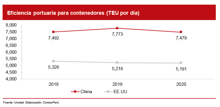 Si analizamos la eficiencia de los puertos para contenedores de China y EE. UU. (es decir, de las principales economías del mundo), esta se ha mantenido constante durante los últimos años. Según cifras de la Conferencia de las Naciones Unidas sobre Comercio y Desarrollo (Unctad), la eficiencia portuaria para China entre 2018 y 2020 se ha mantenido alrededor de 7,500 TEU por día, mientras que en EE. UU., entre esos años, fue de 5,200 TEU por día.