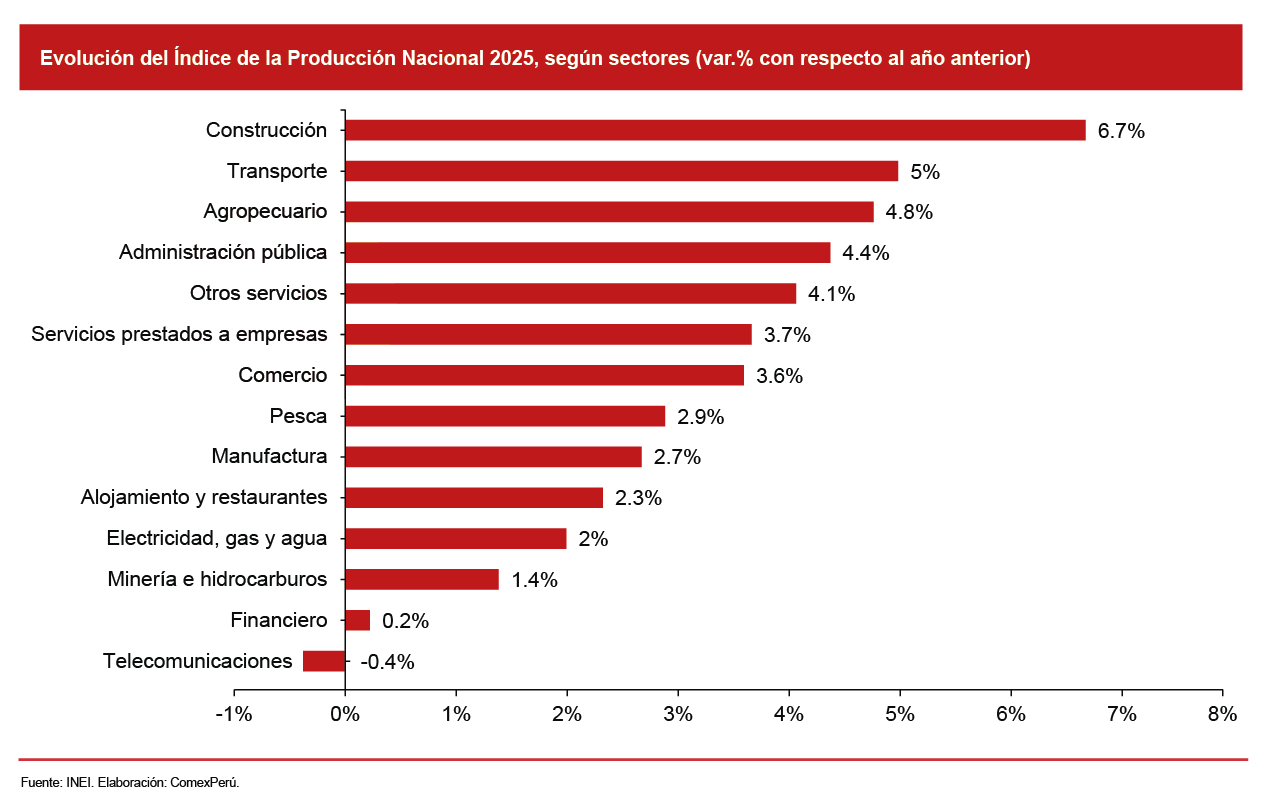 La construcción destacó como el sector más dinámico de la economía en 2025, con un avance del 6.7%, el mayor crecimiento registrado desde 2021. Este resultado consolidó dos años consecutivos de expansión, luego de la contracción del 7.9% observada en 2023. Este desempeño estuvo asociado al mayor consumo interno de cemento y al dinamismo de la autoconstrucción y la inversión privada, así como al avance físico de obras, especialmente a nivel de municipalidades.