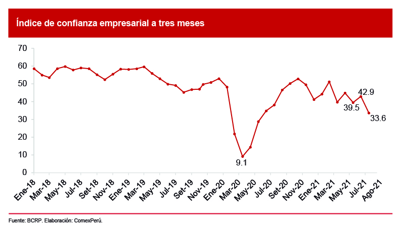 Cabe resaltar que el Índice de confianza empresarial refleja las expectativas de los agentes económicos del país, por lo que resulta un elemento esencial para reactivar la economía e impulsar las inversiones. No obstante, a poco más de un mes de la instalación del nuevo Gobierno, no basta con afrontar los impactos de la pandemia de la COVID-19, sino que se deben generar las condiciones y la confianza para que los inversionistas tengan claridad sobre sus decisiones de invertir en nuestro país.