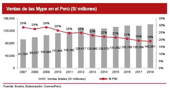Impulsar el desempeño formal de las Mype es una tarea que el Gobierno ha intentado abordar desde varios frentes, como la facilitación tributaria, a través de regímenes especiales, programas especializados de compras públicas, talleres de prácticas empresariales, entre otras iniciativas. Sin embargo, la realidad permanente es que las Mype aún operan en la informalidad y en condiciones de desventaja competitiva. Según la Enaho, la informalidad de estas empresas, medida por su condición de registro frente a la Sunat, se mantiene por encima del 80%, a pesar de que registran ventas anuales en constante crecimiento y que equivalen actualmente a un 19% del PBI.