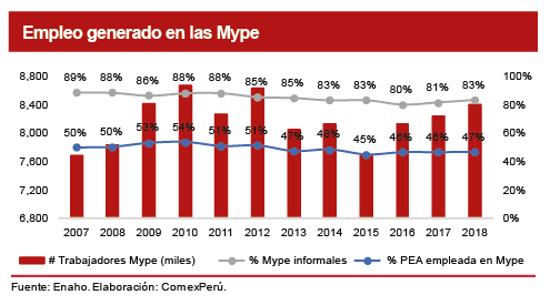 En el Perú, la actividad empresarial se caracteriza por las operaciones de unidades económicas heterogéneas en cuanto a sus ventas, métodos de producción, empleo y nivel tecnológico, siendo los negocios o emprendimientos más pequeños los que predominan en la economía peruana. De acuerdo con cifras de la Encuesta Nacional de Hogares (Enaho), elaborada por el Instituto Nacional de Estadística e Informática (INEI), actualmente, las micro y pequeñas empresas (Mype) representan el 92.7% de las empresas peruanas y emplean a un 47% de la población económicamente activa (PEA). Sin embargo, se encuentran más rezagadas en aspectos clave que determinan su competitividad, como formalización de sus operaciones, innovación, encadenamientos con cadenas productivas, mano de obra calificada y apertura a nuevos mercados.