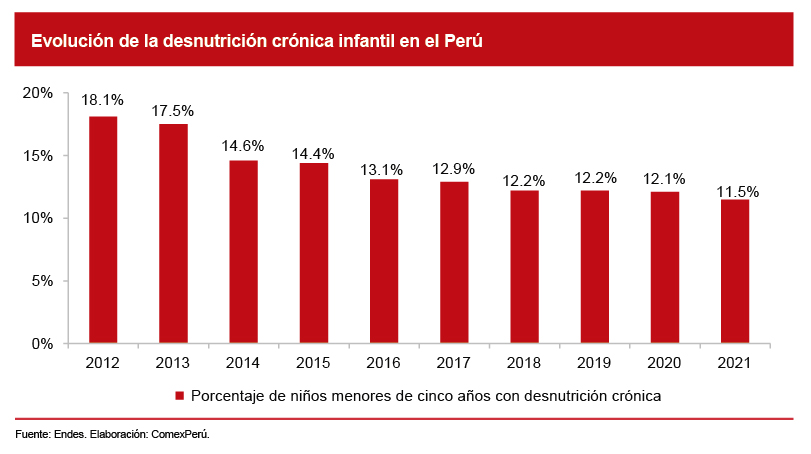 No obstante, la situación de los niños sigue siendo aún vulnerable en el Perú, con persistentes brechas en los principales indicadores de nutrición. Si analizamos la evolución de la tasa de desnutrición crónica infantil (DCI), según cifras de la Encuesta Demográfica y de Salud Familiar (Endes), se observa que en 2012 fue del 18.1% y en 2021, del 11.5%, con respecto a una meta ideal del 5% planteada en el Plan Bicentenario. Por otro lado, en 10 años, la desnutrición crónica solo cayó 6.6 puntos porcentuales, y con respecto a 2020 no hubo una variación significativa. Esto representa un gran desafío para cumplir la meta propuesta, la cual aún estamos lejos de alcanzar.