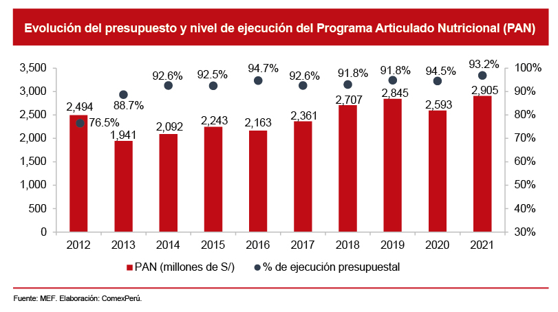 Dicho programa se inició con un presupuesto modificado institucional (PIM) asignado de S/ 1,199 millones y, en 2021, ascendió a S/ 2,905 millones, lo que reflejó un incremento del 142% con respecto a 2008, con una tasa de crecimiento promedio anual del 7% desde su creación. En lo que se refiere al gasto, en 2021, se devengó S/ 2,707 millones, equivalente a un nivel de ejecución del 93.2% del PAN, el cual representa alrededor del 0.37% del valor de todos los bienes y servicios que se producen en nuestro país, una cifra significativa que no debemos pasar por alto.