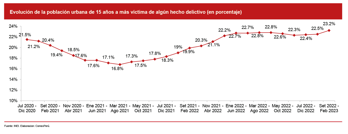 En su último informe sobre estadísticas de seguridad ciudadana para el periodo setiembre 2022-febrero 2023, la proporción de la población urbana de 15 años o más víctima de algún hecho delictivo fue del 23.2%, 0.7 puntos porcentuales (pp) mayor al periodo julio 2022-diciembre 2022 y 3.3 pp por encima del mismo periodo de 2021. Cabe mencionar que dicho resultado se encuentra 6.4 pp por encima del resultado más bajo registrado durante el periodo de pandemia, en el periodo marzo 2021-agosto 2021.