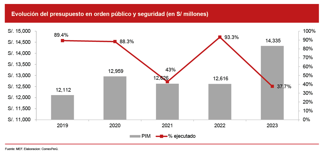 Para afrontar esta situación, el Gobierno asigna un presupuesto a los ministerios con la finalidad de que trabajen en conjunto y se controle dicha problemática. De acuerdo con el Ministerio de Economía y Finanzas (MEF), para el año 2023, el presupuesto en el área de orden público y seguridad se ha incrementado a S/ 14,335 millones, lo que significó un incremento en 14% en relación con lo asignado durante 2022, cuyo presupuesto fue de S/ 12,616 millones. Cabe mencionar que, hasta mayo de este año, se ha ejecutado el 37.7% del total.