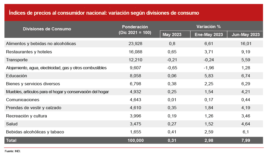 Por otra parte, según el último informe de precios del Instituto Nacional de Estadística e Informática (INEI), el índice de precios al consumidor (IPC) subió un 0.31% a nivel nacional en mayo, mientras que en el periodo acumulado de enero-mayo se registró un incremento del 2.98% y del 7.99% en los últimos doce meses (junio de 2022-mayo de 2023). Cabe mencionar que, en lo que respecta a divisiones de consumo, las que tienen mayor relevancia en el IPC son alimentos y bebidas no alcohólicas (23.9%), restaurantes y hoteles (16.01%) y transporte (12.2%).
