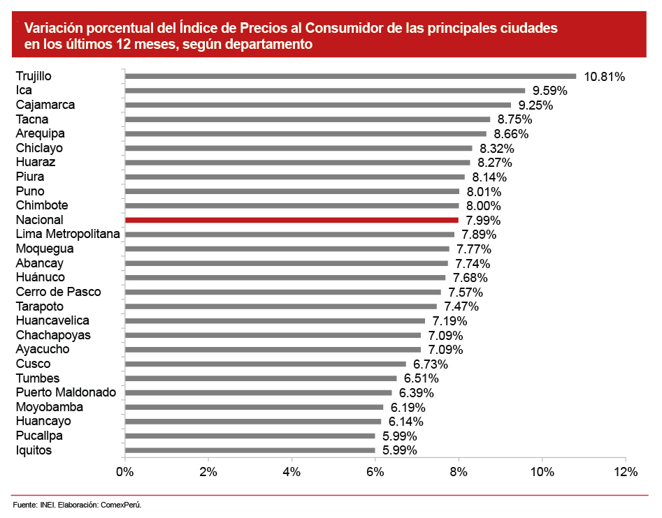 Respecto de las ciudades con mayores variaciones porcentuales del IPC en los últimos doce meses, en primer lugar se encuentra Trujillo, con el 10.81%, seguido por Ica (9.59%), Cajamarca (9.25%), Tacna (8.75%) y Arequipa (8.66%). Por su parte, las ciudades que presentaron menor variación de precios fueron Puerto Maldonado (6.39%), Moyobamba (6.19%), Huancayo (6.14%), Pucallpa e Iquitos (ambos con una tasa del 5.99%).