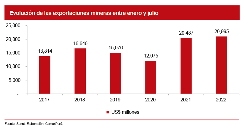 De acuerdo con cifras de la Sunat, en el periodo enero-julio de 2022, las exportaciones mineras alcanzaron un valor de US$ 20,995 millones, lo que representa un crecimiento del 2.5% con respecto al mismo periodo de 2021, y es un 73.9% mayor al registrado en 2020. Sin embargo, es importante mencionar que nuestros envíos de cobre apenas crecieron un 0.14%, mientras que nuestras ventas de oro retrocedieron un 0.9%.