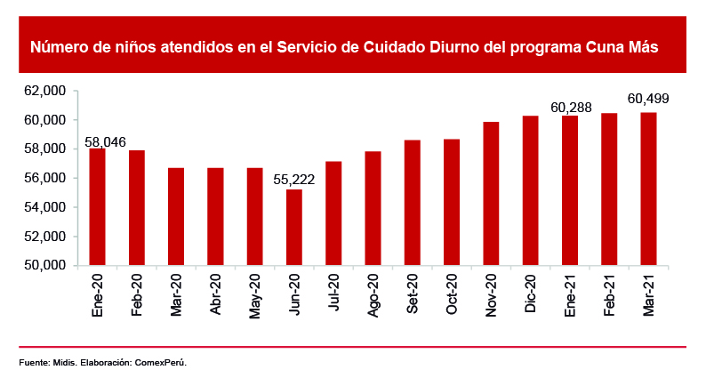 Se debe rescatar que el uso de tecnología ha permitido que aquellos servicios presenciales migren a modalidad virtual, con lo cual programas como Cuna Más han expandido su cobertura, al pasar de 58,046 niños atendidos en el Servicio de Cuidado Diurno en enero de 2020, a atender 60,499 niños en marzo de 2021. No obstante, el brindar monitoreo y consejería telefónica y por mensajes de texto no permite que el programa cumpla sus funciones originales; además, limita la atención con base en los recursos tecnológicos de los que dispongan las familias. En concreto, la falta de infraestructura de telecomunicaciones en regiones como la sierra y selva impone una restricción al acceso al programa bajo el estado de emergencia.