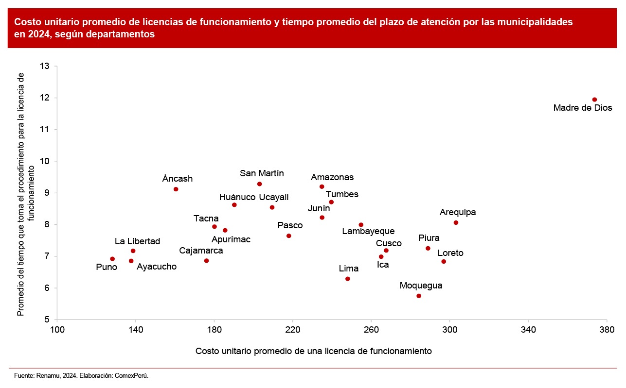 En contraste, entre los departamentos con menores costos para tramitar una licencia destacaron Áncash (S/ 161), La Libertad (S/ 139), Ayacucho (S/ 138), Puno (S/ 128) y Huancavelica (S/ 64). Los tres últimos sobresalen entre los más informales en materia laboral, de acuerdo con el reporte de desempeño del mercado laboral, elaborado por ComexPerú. Esto sugiere que el costo de tramitar una licencia podría explicarse por la demanda en cada departamento, pues en los más informales el costo es menor porque existen menos solicitudes de licencias de funcionamiento.