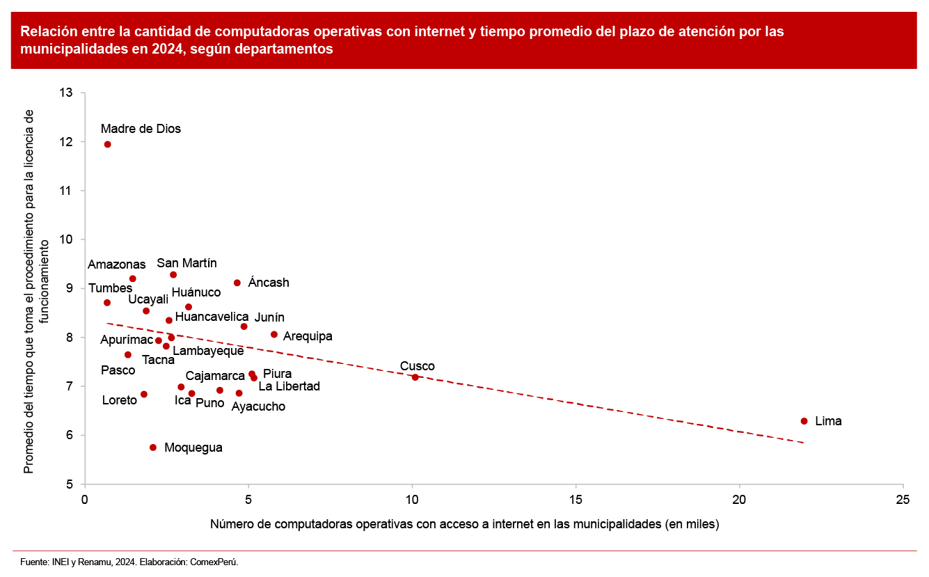 La capacidad administrativa sería un factor clave que explique las diferencias. Los Gobiernos locales con personal capacitado, recursos adecuados y procesos bien gestionados suelen ofrecer trámites más ágiles. Esta relación se vuelve más evidente al analizar la cantidad de computadoras operativas con internet en las municipalidades, estimada por el INEI. A mayor disponibilidad tecnológica, menor es el tiempo promedio para tramitar una licencia, lo que sugiere que los recursos adecuados son un factor determinante en la eficiencia de atención municipal.