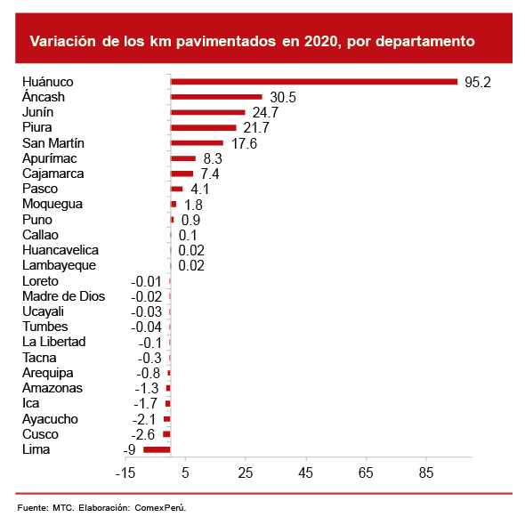 A nivel departamental, solo Huánuco, Áncash, Junín, Piura y San Martín experimentaron un aumento de más de 10 km en su pavimentación, y sobresale el primero con 95.2 km. Apurímac, Cajamarca, Pasco y Moquegua tuvieron un aumento mucho más leve, mientras que en 11 departamentos la variación (positiva o negativa) fue de menos de un km. En los cinco restantes, los km pavimentados disminuyeron, y resalta Lima con 9 km menos.
