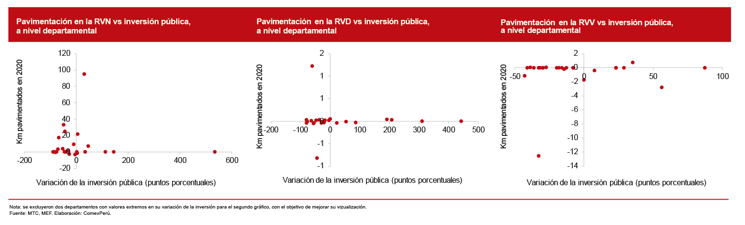 Pero lo más resaltante, quizás, es que no existe una asociación directa entre estos incrementos de inversión y los resultados de pavimentación. En la RVN, tan solo un par de departamentos experimentaron tanto un salto en el número de sus km de carreteras pavimentadas, como en su inversión; mientras que, en varios casos, hubo departamentos con incrementos en los km pavimentados y una menor inversión. En la RVD y la RVV, la relación entre ambas variables es imperceptible, ya que en casi todos los departamentos los km pavimentados han permanecido constantes, mientras que la inversión pública oscila notoriamente.