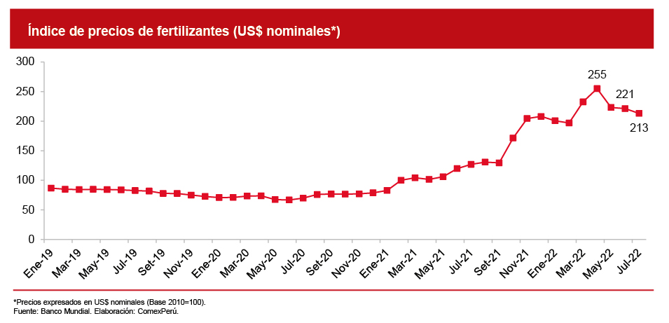 La poca disponibilidad de fertilizantes afecta a diversos productos; entre los cuales destaca el arroz, debido a que es uno de los principales cultivos en el Perú (en 2021, contribuyó con el 12.1% del valor de producción agrícola) y de los que más fertilizantes necesita. Según el Midagri, el 27.3% de los costos involucrados en la producción de arroz corresponden a fertilizantes. Por esto motivo, ya se registra una caída del 21.9% en la producción de arroz de junio de 2022 con relación a junio del 2021, y en una reducción de superficie para cosecha del -24.2%.