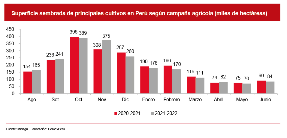 El efecto en la baja producción también se observa al evaluar el avance de la siembra de los 28 principales cultivos[1] (constituyen cerca del 90% de las áreas cultivadas en el país). Según el Midagri, entre agosto de 2021 y junio de 2022, se registraron 2.13 millones de hectáreas, un resultado ligeramente inferior al mismo periodo de agosto de 2022 (-0.1%). Sin embargo, entre enero y junio de este año, la superficie sembrada se redujo un 6.9% respecto del mismo periodo de 2021. Asimismo, en el mes de junio de este año, la superficie sembrada se redujo un 6.2% con respecto a junio del año pasado.