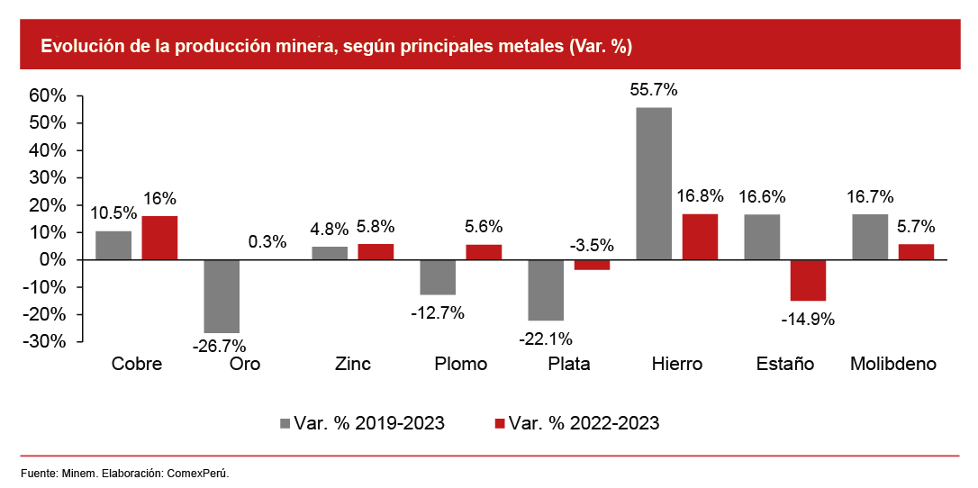 De acuerdo con el Minem, durante el periodo enero-septiembre de 2023, se registraron incrementos importantes en la producción de los principales metales de la industria nacional. Destacó el desempeño del cobre, con un aumento en su producción del 16% con respecto al mismo periodo del año pasado. La empresa que más contribuyó a este resultado fue Anglo American Quevalleco, por su desempeño en Moquegua, tras multiplicar por 10 veces su producción lograda en 2022. Otras empresas que lideraron el resultado de este mineral fueron Minera Las Bambas (+21.7%) y Marcobre (+33.4%).