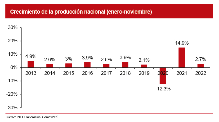 El Instituto Nacional de Estadística e Informática (INEI) publicó, el pasado 15 de enero, su más reciente informe técnico de producción nacional, en el cual se expone el desempeño de los distintos sectores de la economía durante el periodo enero-noviembre de 2022. En dicho boletín se muestra que, a lo largo de ese periodo, la producción nacional registró un crecimiento del 2.7% con respecto al mismo periodo de 2021. Cabe mencionar que, en lo que se refiere al mes de noviembre, se registró un crecimiento del 1.68% con relación a similar mes del año previo.