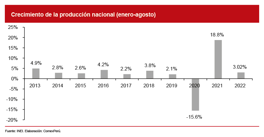 Según cifras del Instituto Nacional de Estadística e Informática (INEI), entre los meses de enero y agosto de 2022, la producción nacional registró un crecimiento del 3.02% con respecto al mismo periodo de 2021. En lo que se refiere al mes de agosto, se registró un crecimiento del 1.68% con relación a similar mes del año previo.