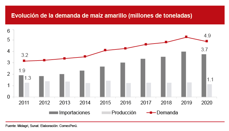 La demanda local del maíz amarillo duro, como se observa en el gráfico, ha sido creciente durante los últimos diez años. De acuerdo con cifras del Ministerio de Desarrollo Agrario y Riego (Midagri), en el periodo 2011-2020, esta registró un crecimiento promedio anual del 4.9%, al pasar de 3.2 toneladas en 2011 a 4.9 toneladas en 2020. Contrario a lo que se cree, las importaciones son un complemento importantísimo para la industria nacional, pues publicaciones previas del Midagri reconocen que el avance de las importaciones en los últimos años se explica por la menor producción nacional y la presión de la demanda interna, en especial de la industria de alimentos balanceados (principalmente avícola).