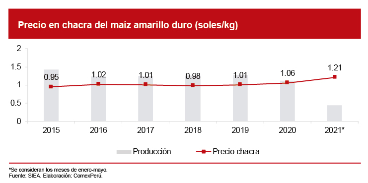 Según cifras de la Oficina de Estudios y Política Agraria, en el mes de mayo de 2021, los maíces del Golfo USA y argentino registraron en promedio US$ 327 y US$ 285 por tonelada, lo que significó un incremento del 116% y el 96% con respecto al mes de mayo de 2020. Asimismo, de acuerdo con la Organización de las Naciones Unidades para la Alimentación y Agricultura, esta alza de precios internacional del maíz se produjo, en gran medida, por la fuerte demanda mundial y una disminución de la oferta.