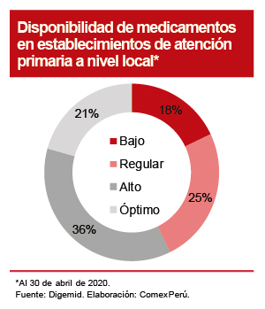 Al 30 de abril de 2020, un 17.9% de los establecimientos de primer nivel de atención a nivel local se encontraba con baja disponibilidad de medicamentos esenciales; un 24.9%, con disponibilidad regular; un 36.6%, con disponibilidad alta; y solo un 20.7% contaba con una cantidad óptima, según la última información reportada por la Dirección General de Medicamentos, Insumos y Drogas (Digemid). Si analizamos por departamentos, los resultados son heterogéneos. Por ejemplo, las direcciones regionales de salud (Diresas) que reportaron mayor número de establecimientos de primer nivel con la baja disponibilidad de medicamentos son Loreto (56.6%), Madre de Dios (50.6%), Piura I (49.1%) y San Martín (42.3%). Estas cifras resultan alarmantes si consideramos que el sistema sanitario de Loreto y Piura se encuentra colapsado a causa de la COVID-19. Por otro lado, cabe destacar algunas Diresas más eficientes en su manejo y que cuentan con más de la mitad de sus establecimientos en óptimas condiciones: Ayacucho (83.7%), Tacna (82.7%), Cajamarca IV-Jaén (61.8%) y Lima Centro (51.4%). Estas cifras reflejan que aún queda mucho por trabajar para garantizar que todos los establecimientos de salud del país cuenten con un abastecimiento óptimo.