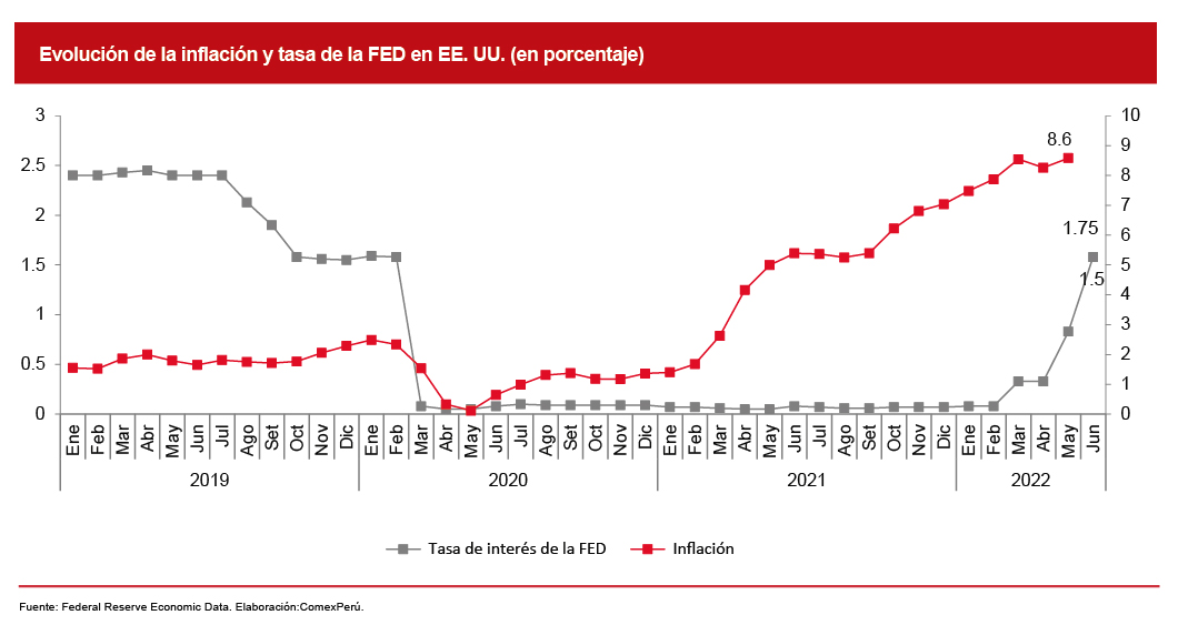 El miércoles 14 de junio, la Reserva Federal de los EE. UU. (FED) incrementó su tasa de interés de política un 0.75%. De este modo, la tasa de interés de la FED pasa de un rango meta del 0.75%-1% al 1.5%-1.75%. Este incremento inusualmente alto corresponde con el índice de precios al consumidor (IPC) registrado en mayo, que indicó que la inflación acumulada en los últimos doce meses aumentó un 8.6%, la más alta en 40 años.