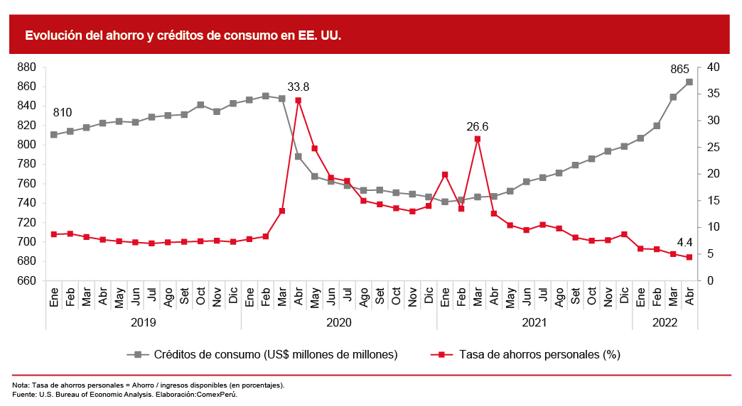 Es necesario mencionar que, tras el inicio de la pandemia, la FED había reducido su tasa de política hasta un rango del 0% y el 0.25% como medida para estimular la economía. Junto a esto, la FED también llevó a cabo operaciones de compra de bonos del tesoro y activos respaldados por hipotecas, para estimular los mercados y mantener el flujo de crédito, lo cual incrementó su hoja de balance. A la par de estas políticas expansivas, en EE. UU. se llevaron a cabo distintos programas de estímulos monetarios para la población que, junto con las restricciones durante la pandemia, impidieron a las personas realizar gastos con normalidad e incrementaron la acumulación de ahorros.