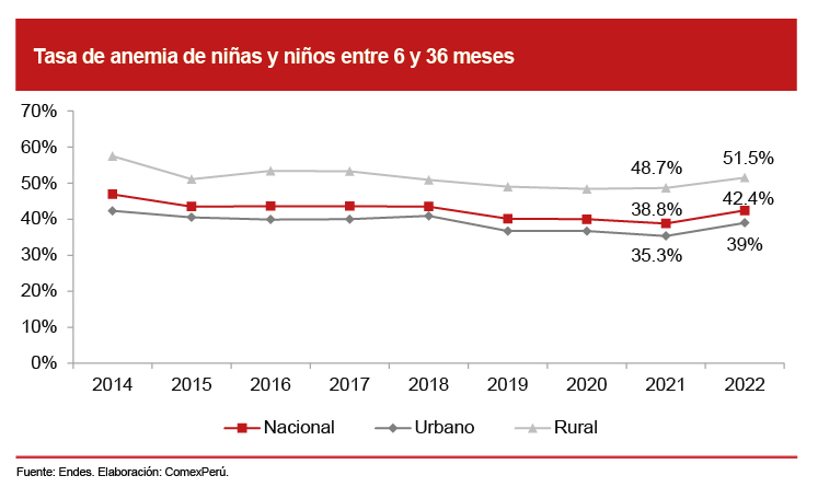 En ese sentido, los resultados de la Encuesta Demográfica y de Salud Familiar (Endes) 2022 son muy preocupantes, pues revelan que la tasa de anemia en niñas y niños entre 6 y 36 meses subió del 38.8% al 42.4%. En el ámbito urbano, este porcentaje aumentó del 35.3% al 39%, mientras que, en el rural, del 48.7% al 51.5%.