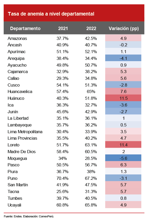 Respecto del primero, el incremento en su tasa ha sido tan grande que ha ingresado al grupo de los departamentos con más del 50% de los infantes con anemia, mientras que Huancavelica, Loreto y Pasco ya se ubicaban entre los departamentos con las tasas más altas del Perú. También cabe resaltar que Tacna, con este aumento, ha dejado de ser el departamento con el menor porcentaje de anemia del país, posición que ahora ocupa Moquegua, que precisamente ha sido aquel en el que esta enfermedad más se redujo.