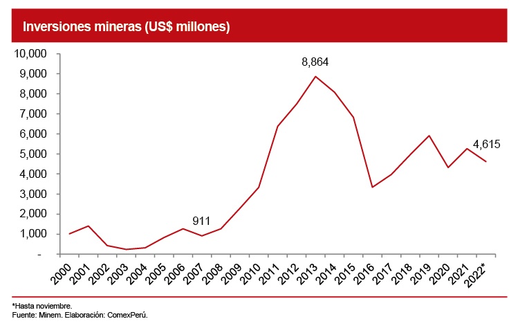 Lo señalado ha traído consigo mayores inversiones recurrentes, tanto para la construcción y ampliación de minas, como para las mejoras en la eficiencia productiva. Por ejemplo, la inversión durante el periodo enero-noviembre de 2022 ascendió a US$ 4,615 millones, aunque en años previos esta cifra ha alcanzado hasta US$ 8,864 millones. Es decir, la inversión anual ha aumentado considerablemente con respecto a los montos que se generaban en 2007 (US$ 911 millones), según cifras del Minem.