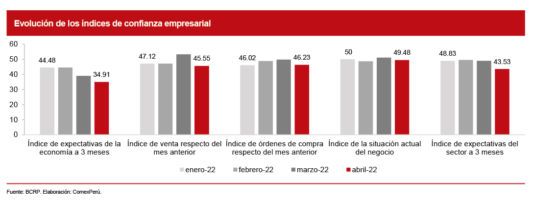 En lo que respecta a las expectativas empresariales, los resultados de abril no han sido positivos. Los índices a tres meses mostraron caídas significativas. Sobre todo, resalta la caída del índice de expectativas de la economía a tres meses, que en enero se encontraba cercana al valor de 50. En abril, el índice alcanzó el valor de 34.91. Además, el índice de expectativas del sector a tres meses, que bordeaba el valor de 50, en abril registró un valor de 43.53.