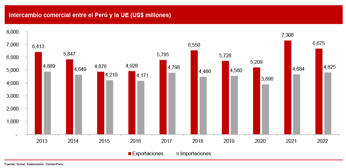 Según las cifras de la Sunat, entre 2013 (año en el que comenzó el acuerdo) y 2022, siempre hemos mantenido una balanza comercial positiva. El valor de nuestras exportaciones ha oscilado entre los US$ 4,000 millones y US$ 7,000 millones —excepto en 2021 (un aumento del 40.3%), debido al “rebote” mundial posterior al primer año de la pandemia de COVID-19—, mientras que nuestras importaciones han fluctuado alrededor de los US$ 5,000 millones. Si se cuenta solo 2022, nuestros envíos a la UE sumaron US$ 6,675 millones y nuestras compras, US$ 4,825 millones.
