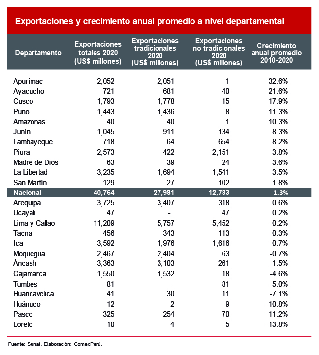 En 2020, exceptuando del análisis los envíos registrados por Lima y Callao, Arequipa lideró los envíos departamentales al mundo, con US$ 3,725 millones, seguido por Ica, con US$ 3,592 millones; Áncash, con US$ 3,363 millones, y La Libertad, con US$ 3,235 millones. Hay que resaltar el desempeño de los departamentos que, a pesar de la afectación de la pandemia, crecieron en exportaciones al año pasado respecto de 2019. Entre estos se encuentran Ayacucho, con un valor exportado de US$ 721 millones y un crecimiento del 129.8%; seguido por Ucayali (US$ 47 millones; +109.6%), Huancavelica (US$ 41 millones; +108.6%), Tacna (US$ 456 millones; +74.4%) y Pasco (US$ 325 millones; +55.3%).