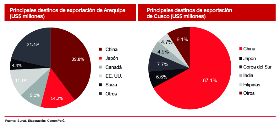 Respecto de los principales destinos de exportación, EE. UU., China y Canadá fueron los principales para las exportaciones departamentales. Por ejemplo, Arequipa mantuvo una mayor interacción con China, hacia donde realizó envíos por US$ 1,481 millones en 2020. Le siguen Japón (US$ 528 millones), EE. UU. (US$ 414 millones), Canadá (US$ 341 millones) y Suiza (US$ 164 millones). De igual manera, Cusco reafirma sus lazos comerciales con China, su principal destino exportador, con US$ 1,202 millones en 2020. Asimismo, destacan sus envíos a Corea del Sur (US$ 139 millones), Japón (US$ 118 millones), India (US$ 87 millones) y Filipinas (US$ 84 millones). En términos generales, la evolución de exportaciones a China, a nivel departamental, es la más favorable, ya que son 8 los departamentos en los que este país genera los mayores ingresos por exportación.