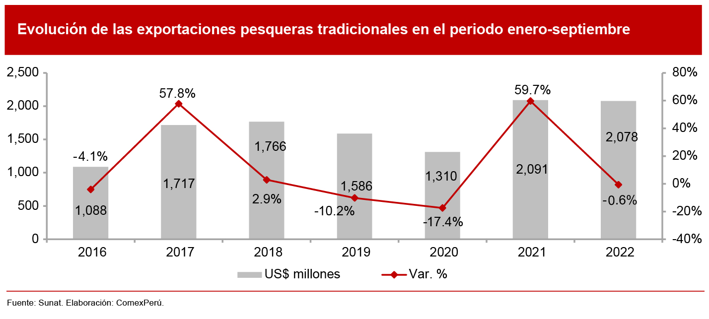 Según cifras de la Sunat, en el periodo enero-septiembre de 2022, las exportaciones del sector pesquero alcanzaron un valor de US$ 3,276 millones, un 0.5% más con relación al mismo periodo de 2021. Dicho monto representó un 6.8% de nuestras exportaciones totales al mundo en el periodo de análisis, con lo que redujo su participación en 0.7 puntos porcentuales (pp.) con respecto al mismo periodo de 2021.