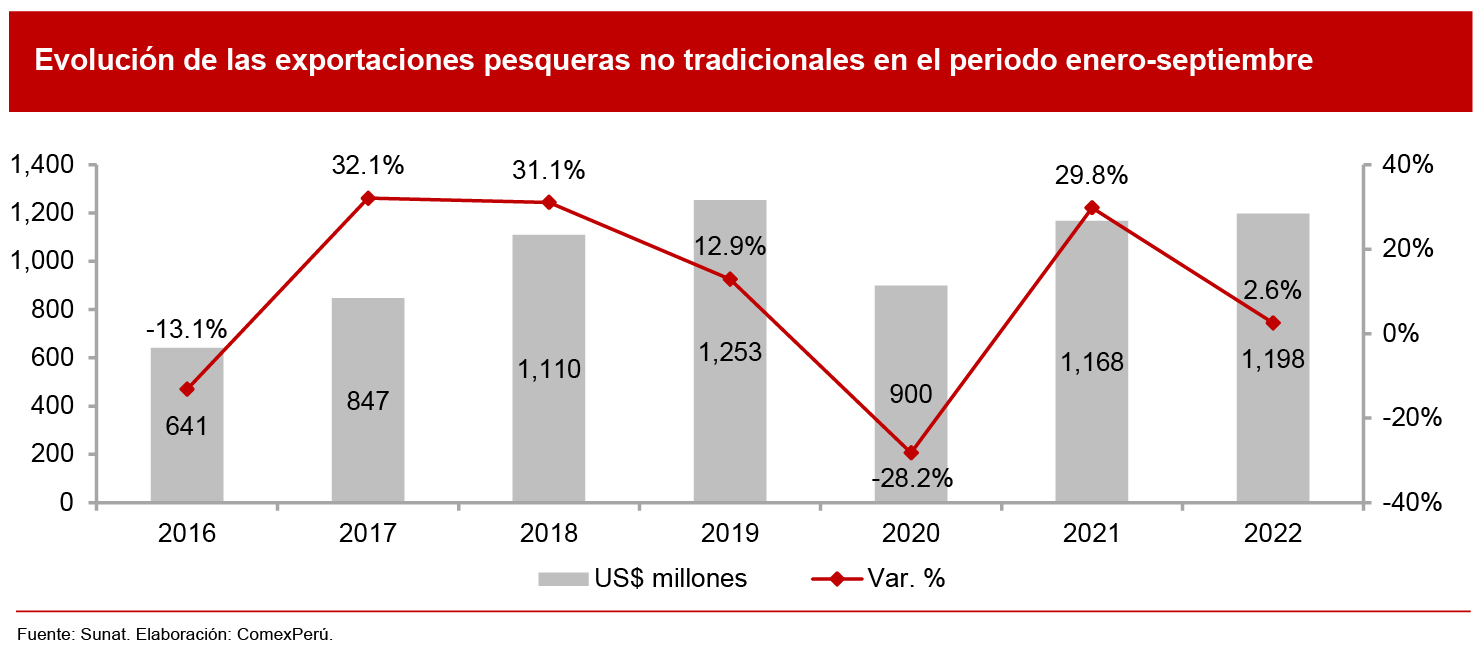 Dicho resultado se debió a la menor extracción de especies de origen marítimo (-15.8%). En esta se encuentran las especies destinadas al consumo humano directo, el cual evidenció un retroceso del 16.2% durante el periodo enero-septiembre. Asimismo, se registró una menor extracción de especies de origen continental (-24.2%), debido a las menores capturas de especies en estado fresco (-44%). Estos resultados afectarían el desempeño de las exportaciones del sector.
