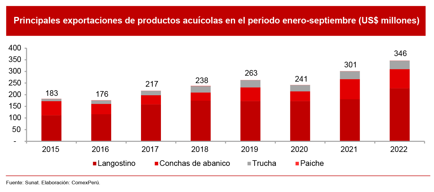 En cuanto a las exportaciones de productos acuícolas[1], de acuerdo con cifras de la Sunat, en el periodo enero-septiembre de 2022, sumaron un total de 41,761 toneladas, lo que representó un monto de US$ 346 millones (+15%). De este total, el 65.7% fueron envíos de langostinos (US$ 228 millones; +25.8%); el 23.7%, de conchas de abanico (US$ 82 millones; -4.6%); el 10.5%, de trucha (US$ 36 millones; +7.2%); y lo restante, de paiche (US$ 36,293; +105.6%).