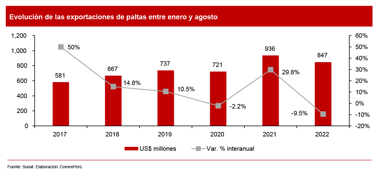 De acuerdo con cifras de la Sunat, entre los meses de enero y agosto del presente año, las exportaciones de palta alcanzaron un valor de US$ 847 millones, lo que reflejó una caída del 9.5% con respecto a similar periodo de 2021 (US$ 936 millones). Cabe mencionar que el valor registrado durante este año fue mayor a los de 2020 y 2019, cuando se produjeron envíos por US$ 721 millones y US$ 737 millones, respectivamente.