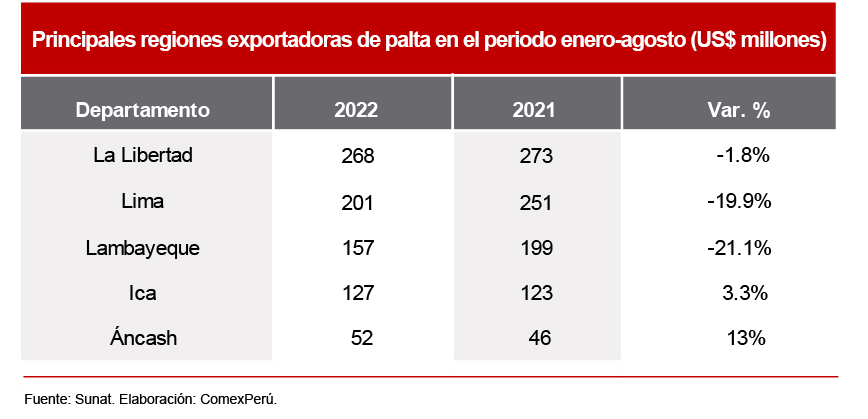 Por otro lado, de acuerdo con cifras de la Sunat, en el periodo analizado, las exportaciones de palta fueron lideradas por La Libertad, con US$ 268 millones, un 1.8% menos que en similar periodo del año pasado. Le siguen Lima, con US$ 201 millones (-19.9%); Lambayeque, con US$ 157 millones (-21.1%); Ica, con US$ 127 millones (+3.3%); y Áncash, con US$ 52 millones (+13%).