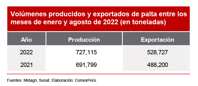 Según datos del Midagri, la producción de palta entre los meses de enero y agosto de 2022 sumó 727,115 toneladas, lo que significa un 5% más que en el mismo periodo del año previo (691,799 toneladas). El área de producción de este cultivo abarca mayormente regiones costeras. La Libertad es una zona que concentra la mayor producción de paltas, con 232,376 toneladas (32% del total de producción) en los primeros 8 meses del año. Le siguen Lambayeque, con 126,484 toneladas (17%), y Lima, con 111,542 toneladas (15%).