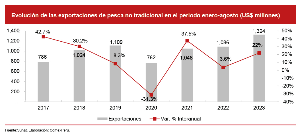El sector pesquero se encuentra en un contexto difícil, a pesar de lo cual las exportaciones del rubro pesca no tradicional registraron un crecimiento del 22% en el periodo enero-agosto de 2023, según cifras de la Sunat. Los envíos al exterior alcanzaron un valor de US$ 1,324 millones, lo que significó US$ 238 millones más que en el mismo periodo del año anterior.
