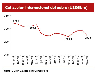 En cuanto a los minerales de cobre y sus concentrados (US$ 4,921 millones; -9.6%), que representaron un 48% de las exportaciones del sector y más del 27% de las exportaciones totales del país, su volumen exportado aumentó un 0.1%, lo que supondría que la principal razón de la caída de estos envíos sería el precio. De acuerdo con datos del Banco Central de Reserva del Perú (BCRP), el precio promedio del cobre en el periodo enero-mayo de 2019 fue de US$ 282 por libra, aproximadamente un 10% menor con respecto al mismo periodo de 2018 (US$ 313 por libra). Dado que China es el principal mercado de destino de las exportaciones peruanas de cobre (representa el 72% del total), la tensión comercial que mantiene con EE.UU. estaría afectando la cotización internacional del cobre, principalmente por la mayor incertidumbre que genera. Cabe mencionar que, en mayo de este año, se registró una caída del 12% con relación al mismo mes de 2018.