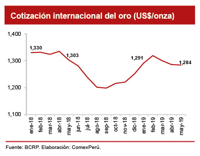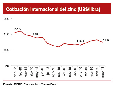 En el mismo periodo de análisis, el escenario para las exportaciones de oro y zinc fue diferente, pues cayeron ambos tanto en volumen como en precio. El oro en las demás formas en bruto sumó un total de US$ 2,600 millones, un 14.8% menos con respecto al periodo anterior, debido principalmente a una caída del 17.2% en volumen y, de acuerdo con datos del BCRP, el precio promedio del oro fue de US$ 1,296 por onza, un 2% menos que en el mismo periodo de 2018 (US$ 1,325 por onza). De igual manera, los concentrados de zinc alcanzaron un total de US$ 687 millones, un 31.5% menos con respecto al periodo anterior. Su volumen cayó un 14.7% y el precio promedio se abarató en un 16%, al pasar de US$ 149.7 por libra en 2018 a US$ 125.1 por libra en el periodo enero-mayo de 2019.