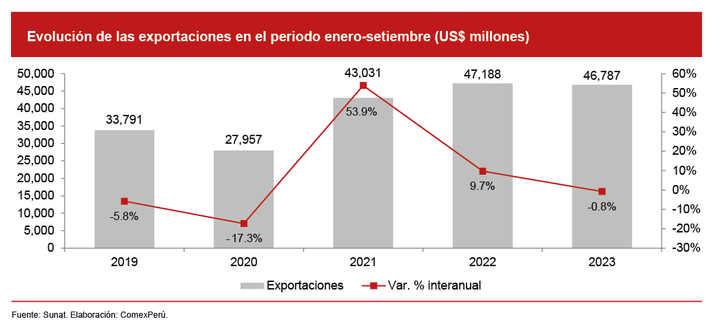 De acuerdo con cifras de la Sunat, durante el periodo enero-setiembre de 2023, las exportaciones peruanas sumaron US$ 46,787 millones, lo que significó una caída del 0.8% en comparación con el mismo periodo de 2022. Dicho resultado se explicaría tanto por la caída del sector tradicional (-0.5%), que representa el 72.5% del total de nuestros envíos al mundo, como por la del no tradicional (-1.7%).